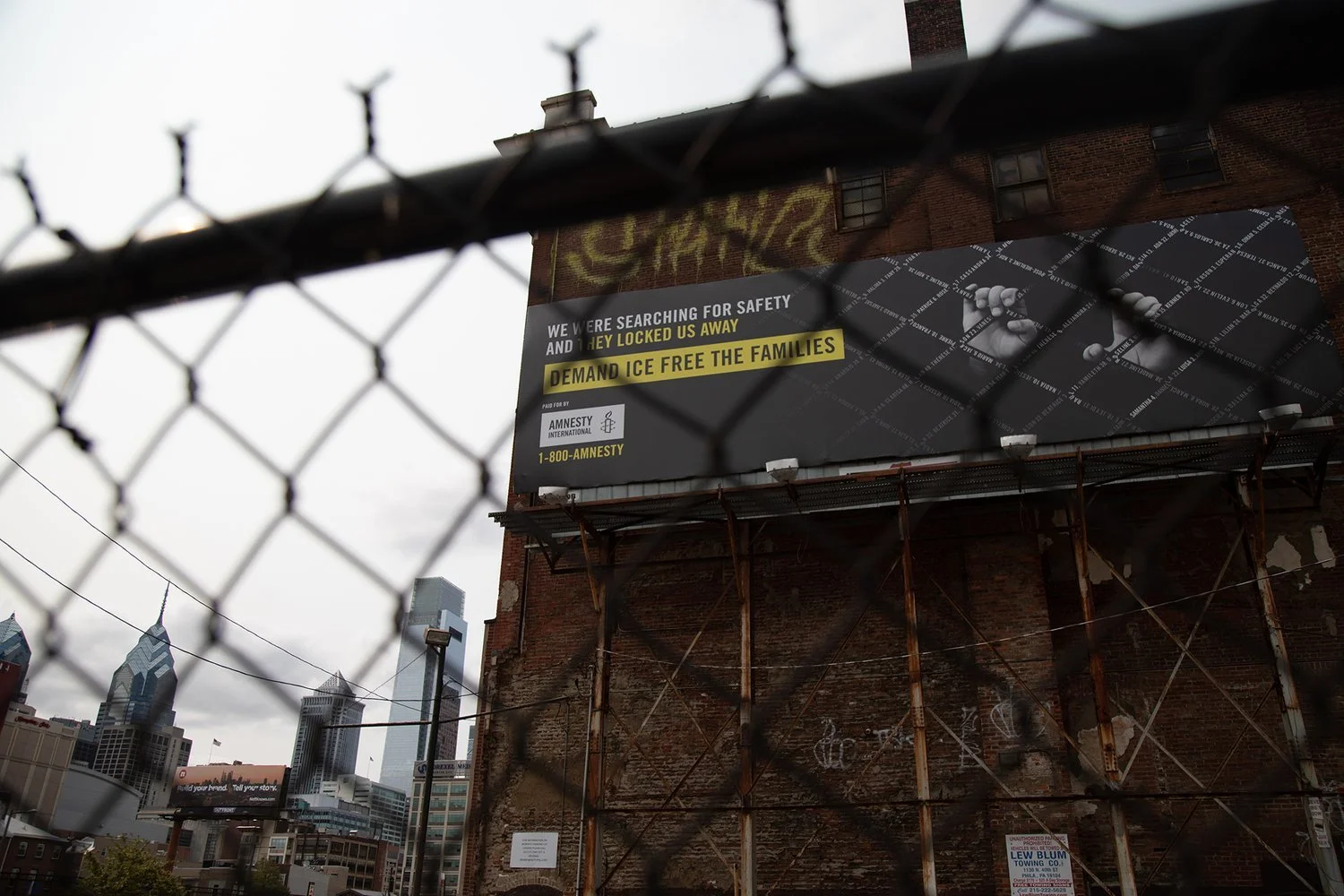 The billboards confront viewers with a black and white image of a child’s hands behind chain links, with the chain links each featuring the names of dozens of children and their parents currently detained in Texas and Pennsylvania.